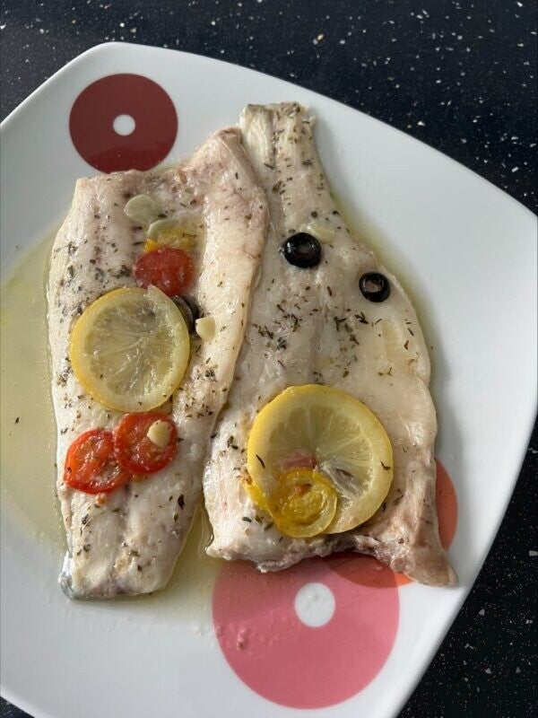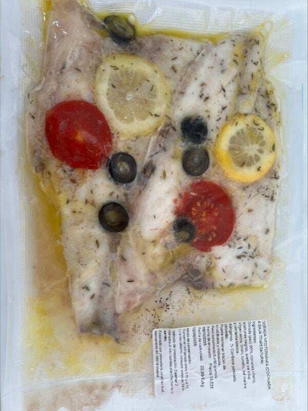 Doradas a la mediterrranea con aceitunas negras tomates cherry ajo natural y limon fresco cocinadas a baja temperatura no superior a 50 grados peso aproximado 0,480 gramos netos