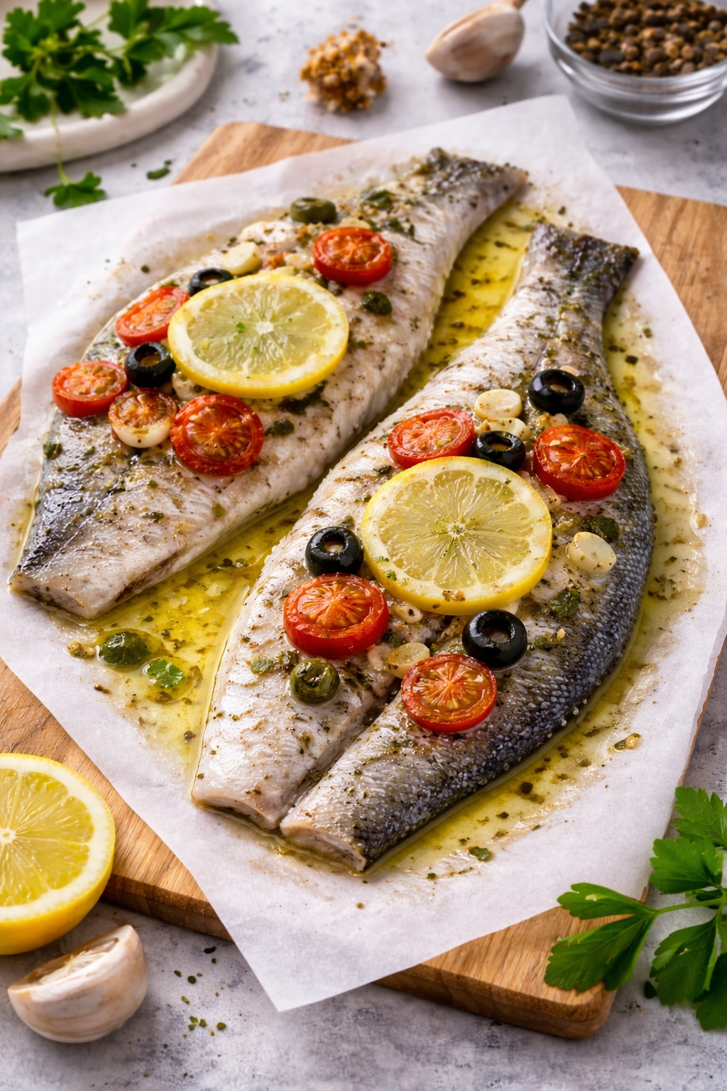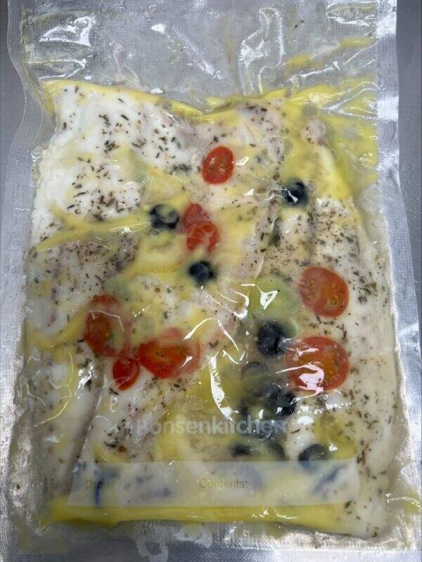 Lubinas a la mediterra cocinadas a baja temperatura con tomates cherry aceitunas negras limon natural ajo fresco aove peso aproximado 0,480 gramos ideal para 2 personas